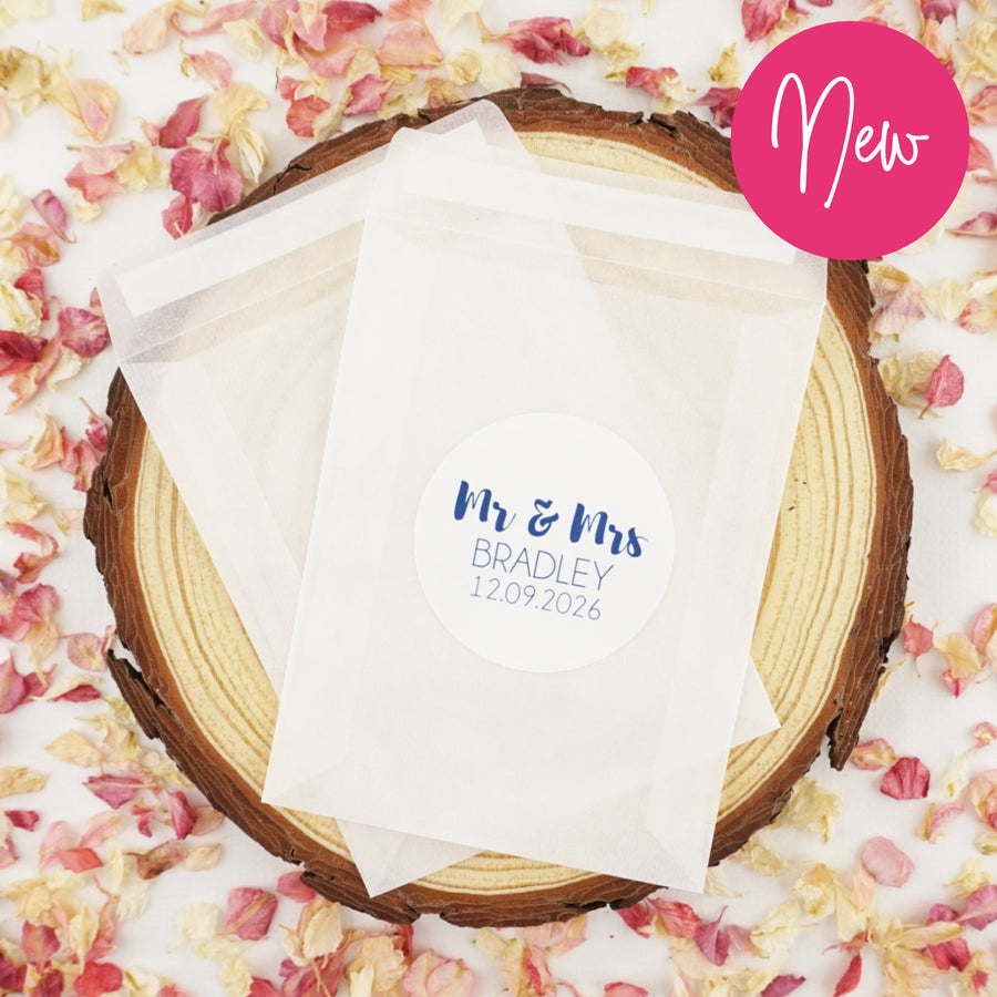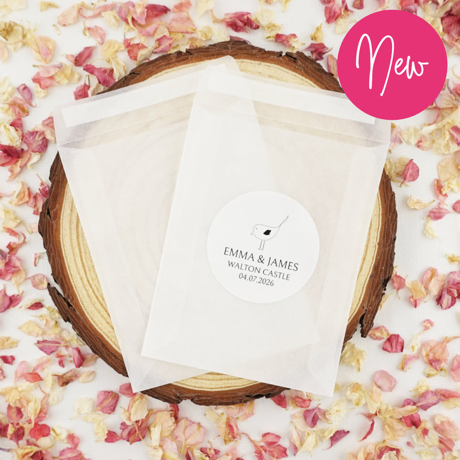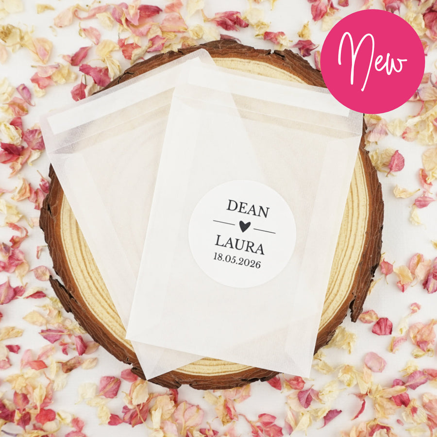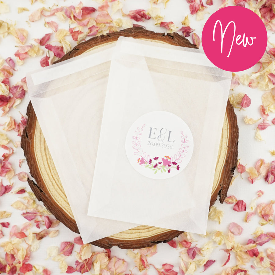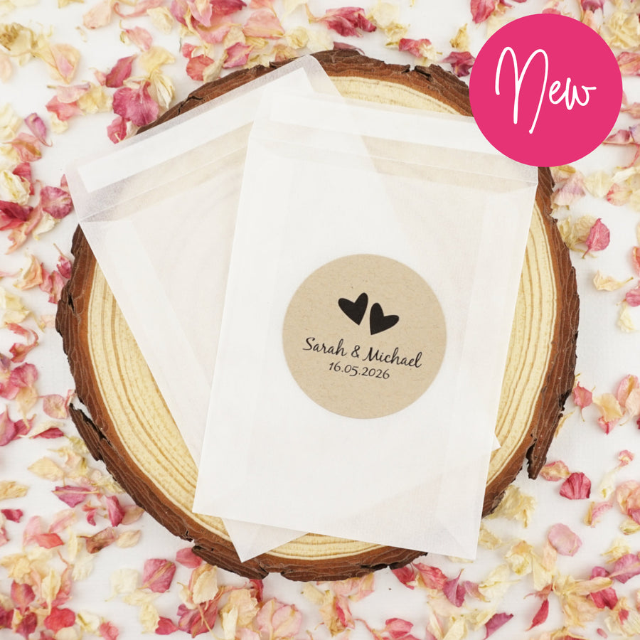 Glassine envelopes are semi-transparent and fully biodegradable. They are an excellent way to present your wedding confetti in portions ready for your guests. This collection offers our glassine envelopes in two ways: Fully assembled and ready for use - you don't need to do anything other than pop them into whatever you would like to present them in, such as a basket or tray. Or, you can save by purchasing the glassine sachets separately and creating your own DIY confetti bags.
