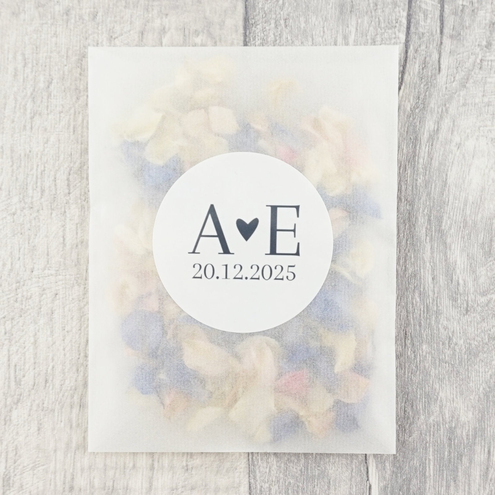 Cute individual portions of our luxury dried petal wedding confetti presented in semi-transparent glassine envelopes. Each envelope holds around 60ml of petals which provides a small handful of confetti per guest. Each envelope is embellished with a 50mm round sticker featuring the personalised Enchanting initials design.