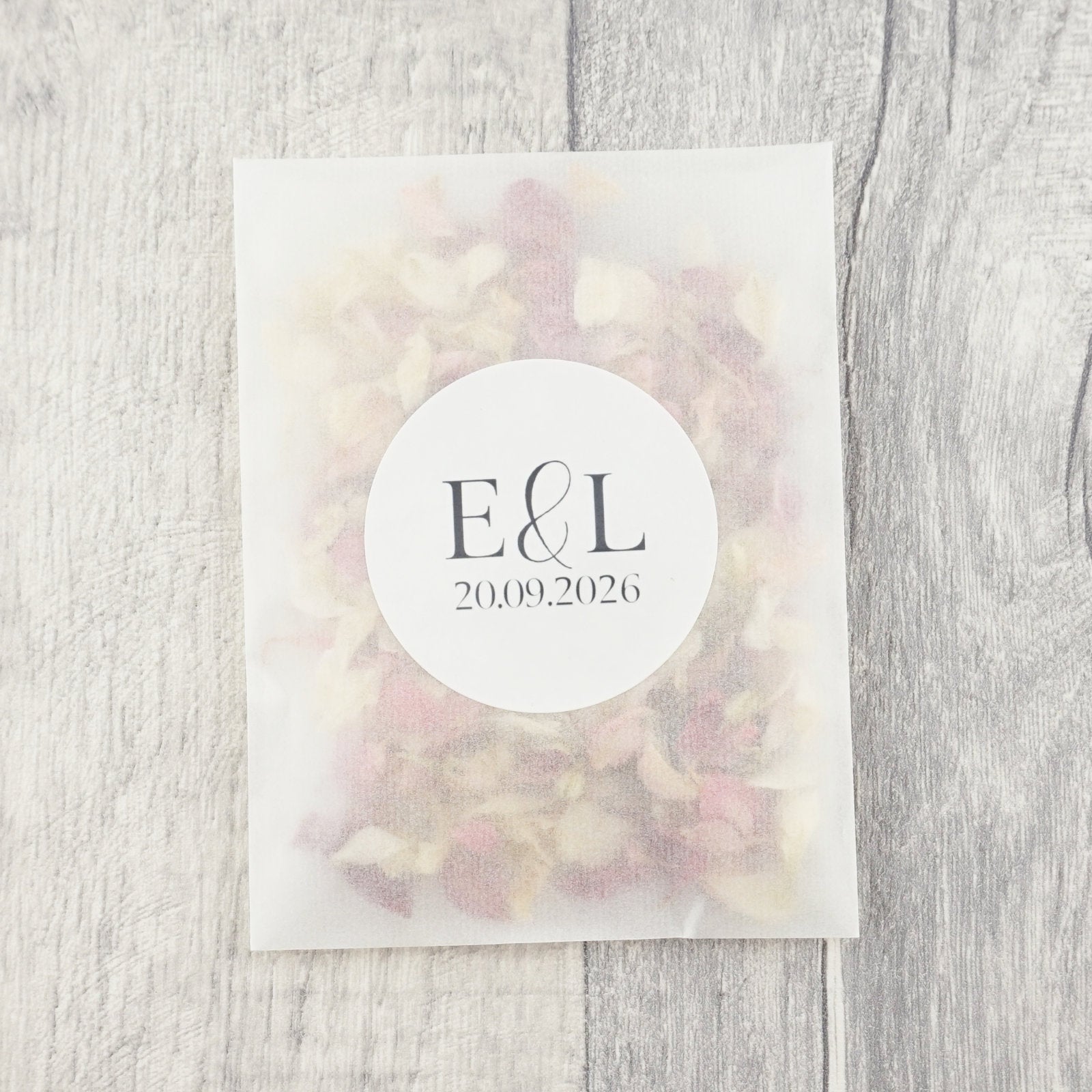 Cute individual portions of our luxury dried petal wedding confetti presented in semi-transparent glassine envelopes. Each envelope holds around 60ml of petals which provides a small handful of confetti per guest. Each envelope is embellished with a 50mm round sticker featuring the personalised Tranquil initials design.