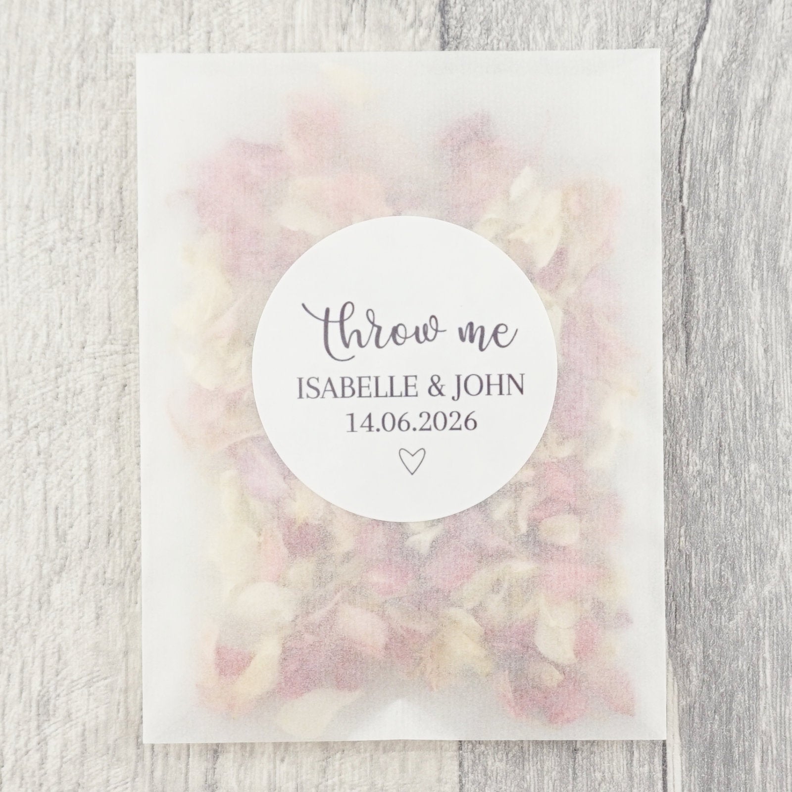 Dried petal wedding confetti presented in glassine envelopes embellished with the personalised Romantic Throw Me sticker.