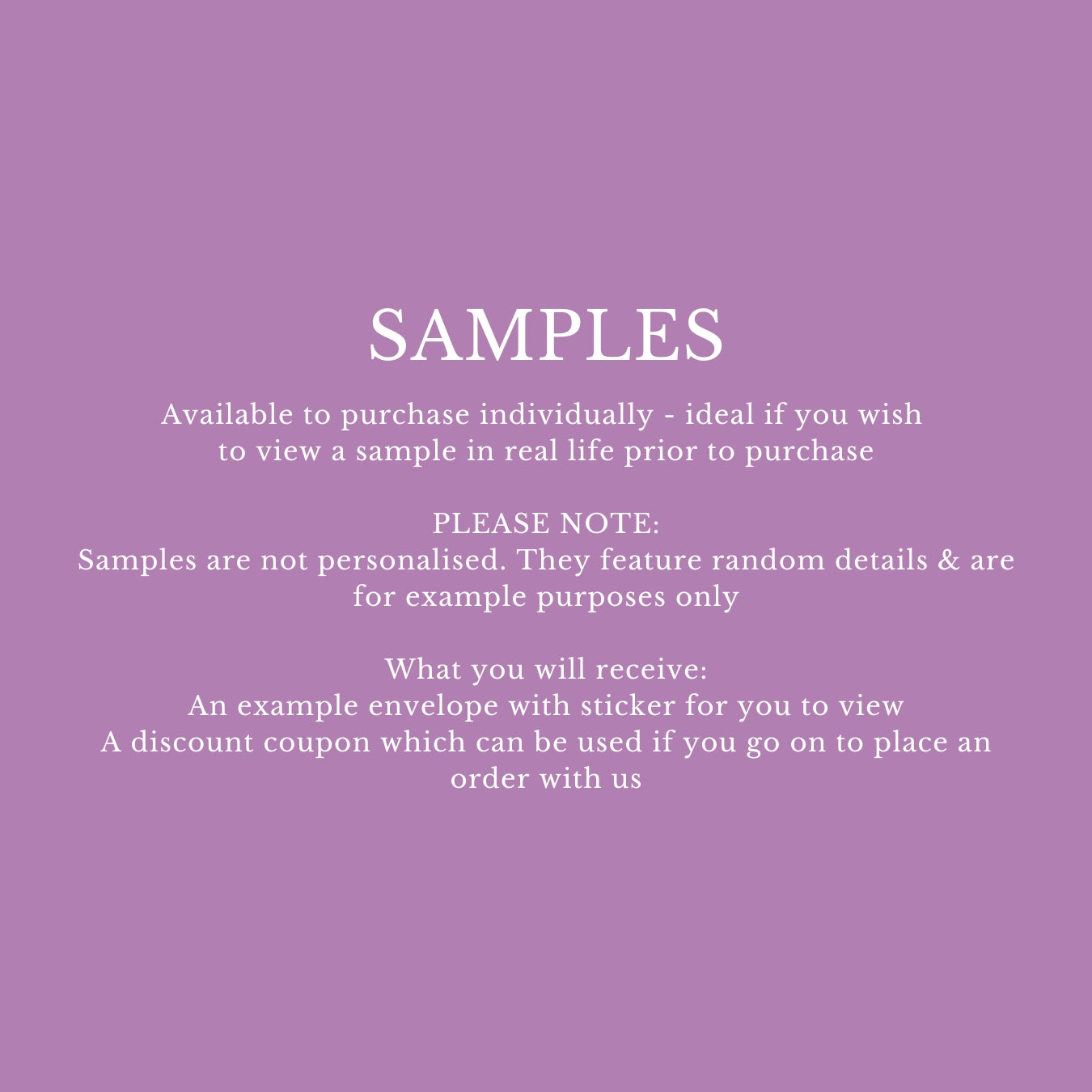 If you purchase a sample you will receive 1 empty envelope with the printed design. Samples are not personalised, they feature random details for example purpose only.