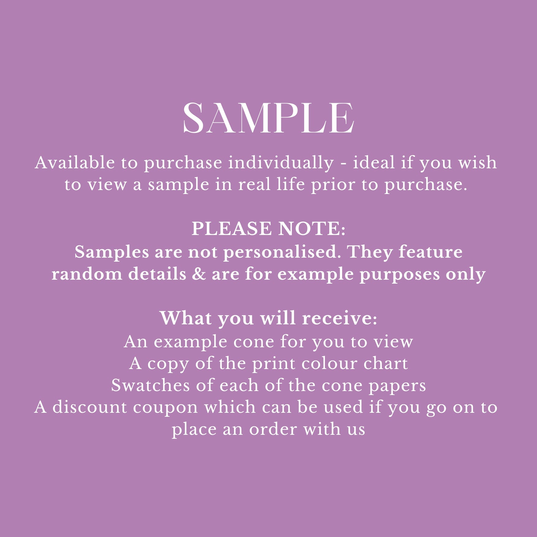 Available to purchase individually if you wish to view a sample prior to placing an order. Sample cones are not personalised, they feature random details & are for example purposes only. You will also receive a print colour chart with your sample so you are able to view the range of print colours for the personalisation, swatches of the cone colours & a discount coupon which can be used if you go on to place an order with us.