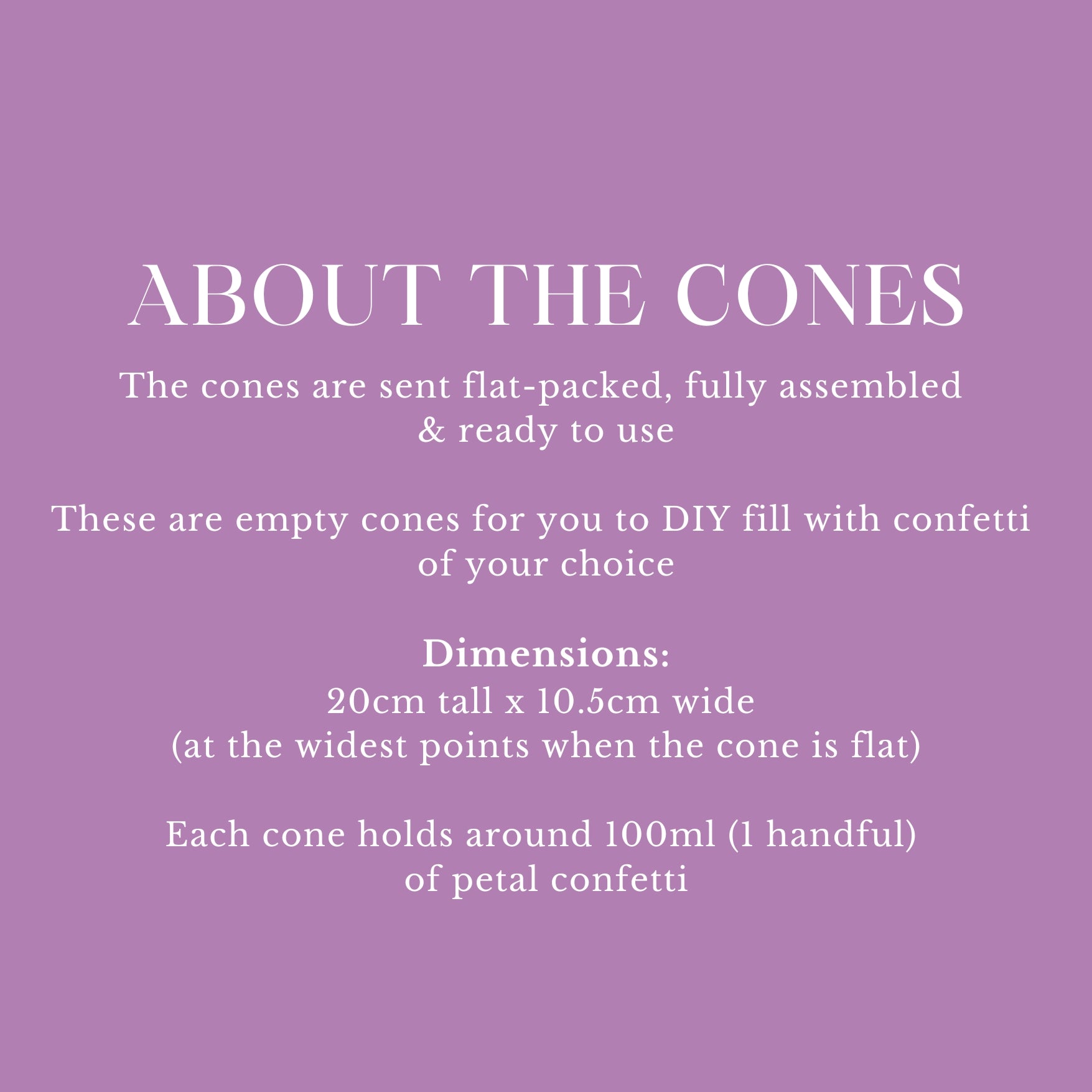 Each cone will hold up to 100ml of our dried petal confetti - that’s around 1 litre per 10 cones & will provide 1 generous / 2 small handfuls per cone.