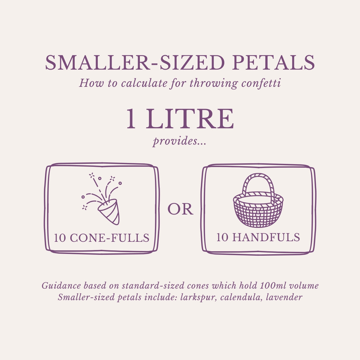 1 litre will fill around 10 standard confetti cones (or 10 handfuls) ... depending on how generous you want to be.
