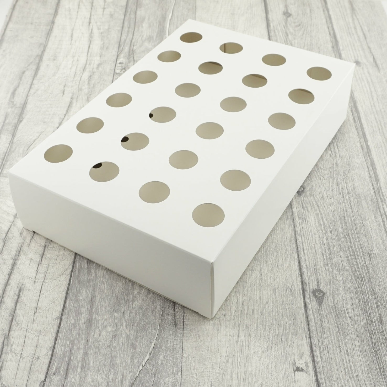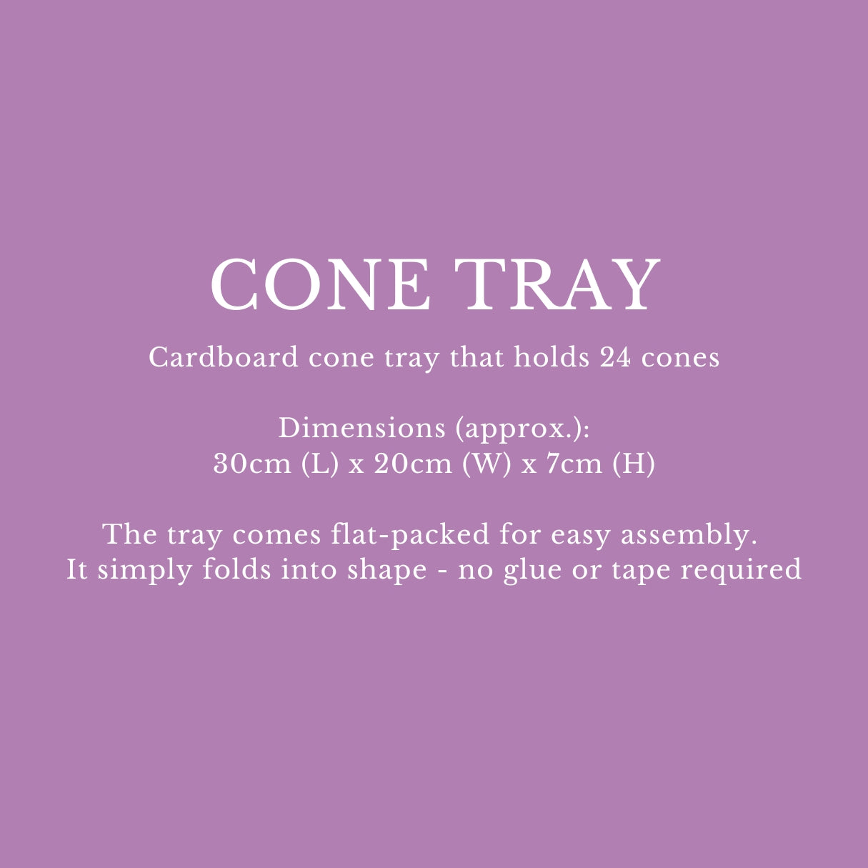 The tray holds 24 cones. It comes flat packed for easy assembly - it simply folds into shape - no glue or tape required.