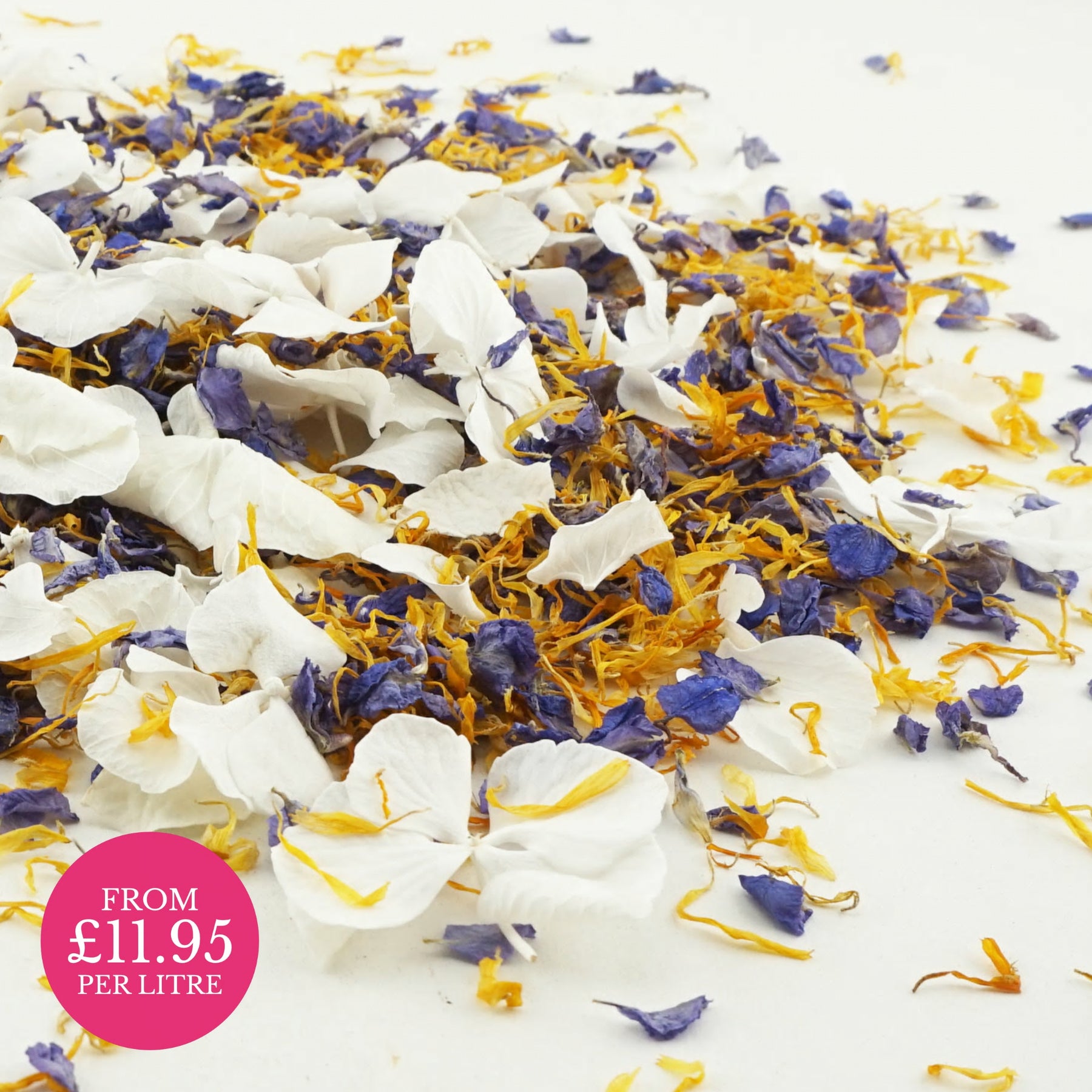 Summer Days - Freeze dried hydrangea petals in delicate ivory mixed with our Blueberry Fool larkspur petals & golden calendula petals