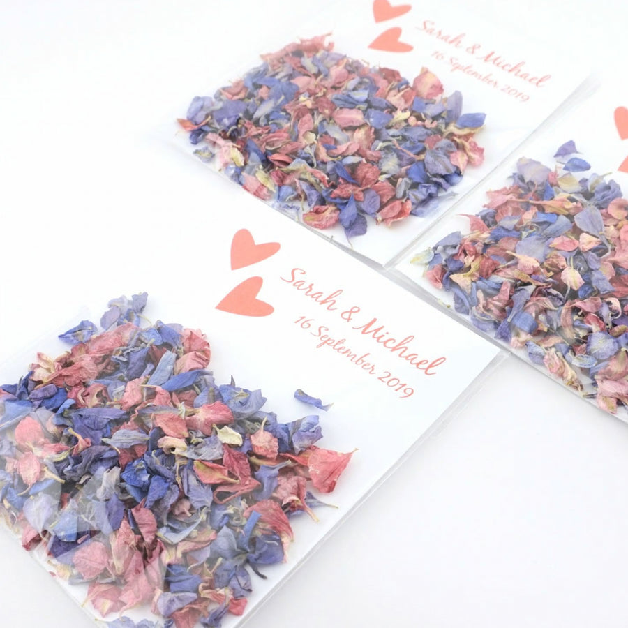 This listing offers our luxury, larkspur / larkspur & wildflower dried petal confetti beautifully presented in clear envelopes with a customised backing card.